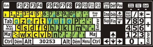 Autocollants français (France) pour clavier divisé gauche/droite: noir sur jaune et noir sur vert avec voyelles bleues (minuscules) - 30253